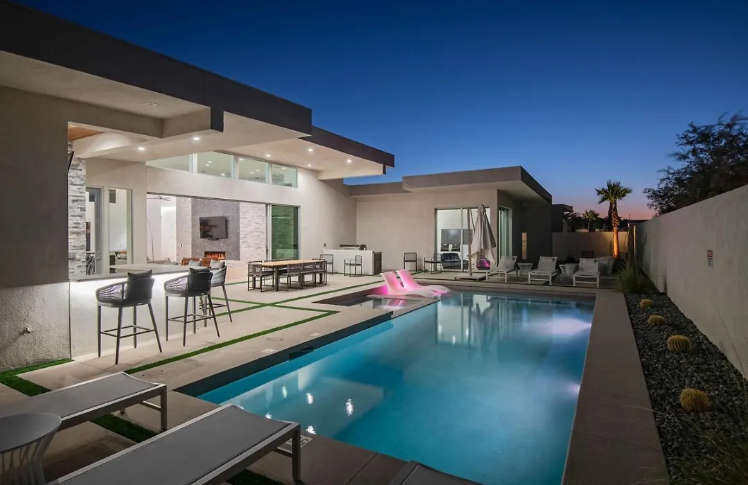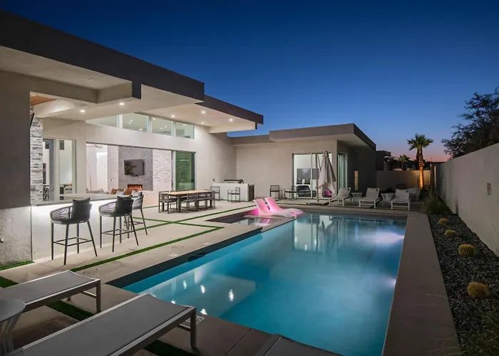 Krypton @ Elemento49 Pool Spa Sleeps 16 La Quinta villa offers proximity to nearby tourist spots, such as the Riverside County Fairgrounds|Riverside County Fairgrounds, situated 3.5 km away. This holiday home includes complimentary private parking and a terrace with views of the mountain.